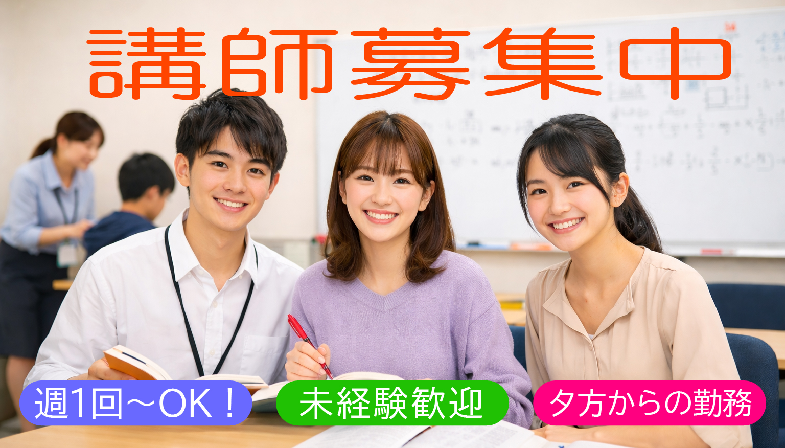 もちろん、悩むこともあります。でも、一人の生徒の笑顔が見られたとき、 あなた自身も、昨日より少し成長しているはずです。 私たちと一緒に、最高に熱くて温かい時間を過ごしませんか?